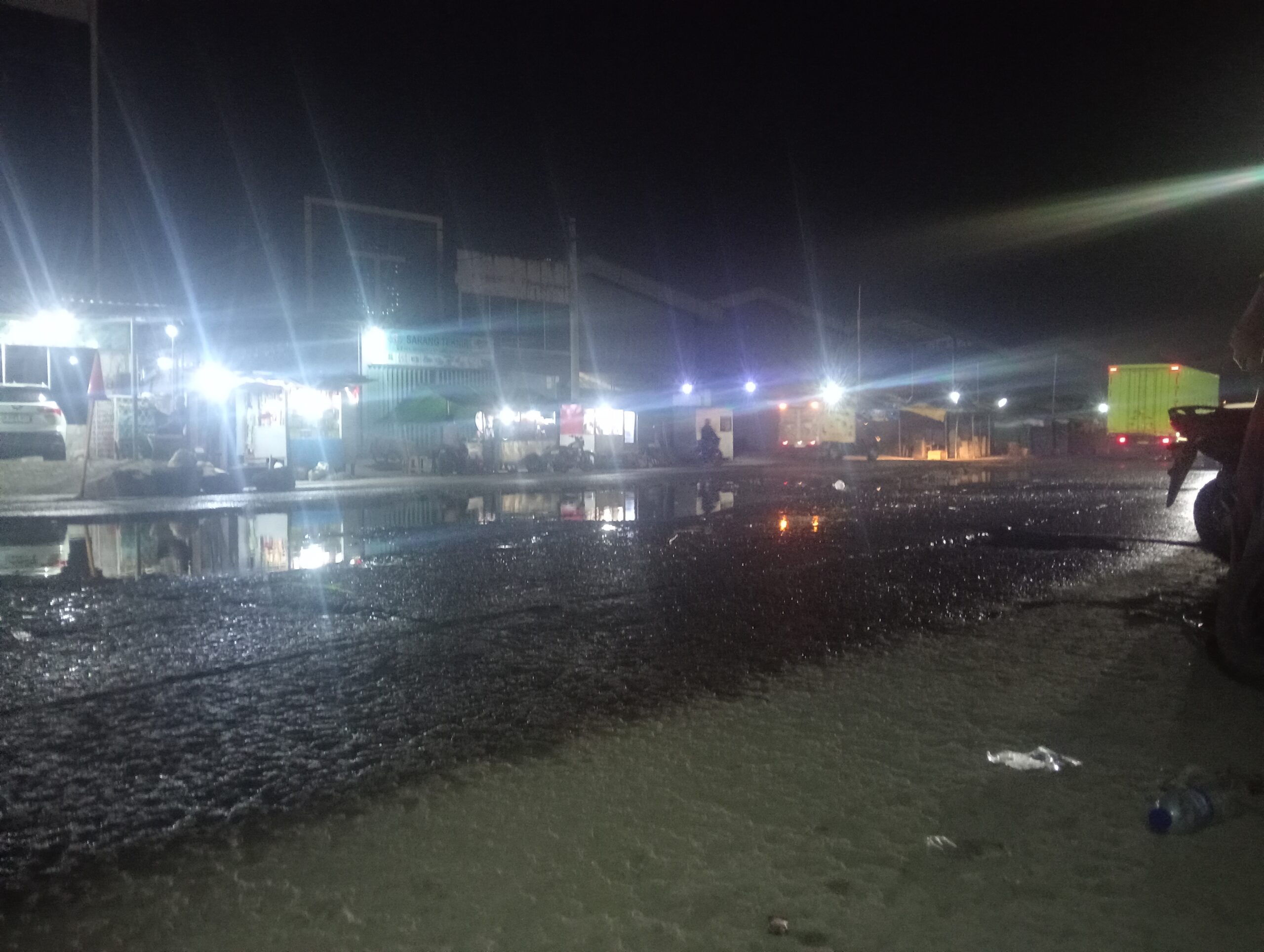 Terlihat Pantauan Di lapangan Jalan yang berlubang di sertai genangan air,jika tidak segera di perbaiki kemungkinan akan mengakibatkan kecelakaan.