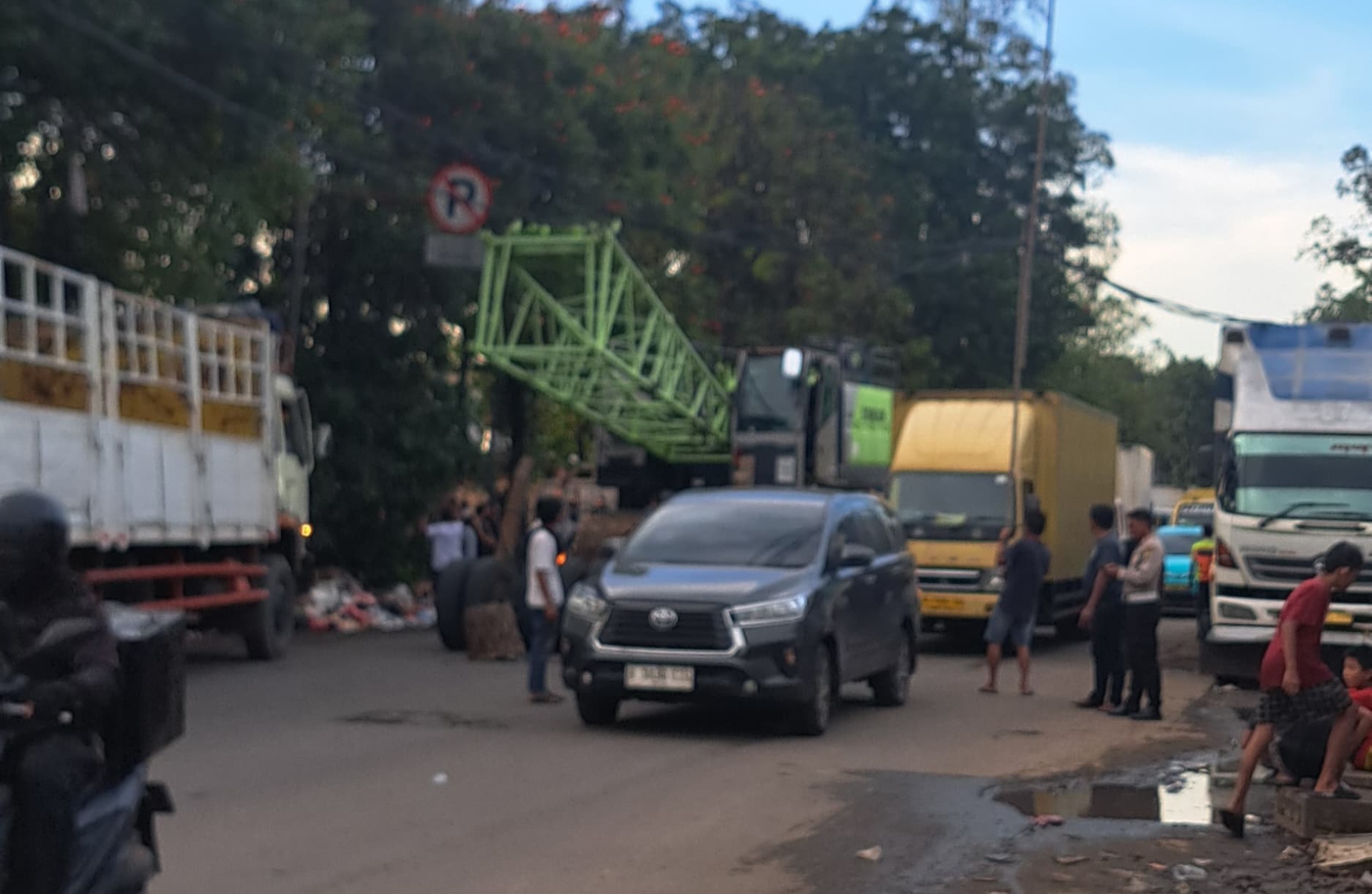 Kota Tangerang – Kemacetan panjang terjadi di Jalan Husain Sastranegara pada Jumat (10/4/2026) sekitar pukul 15.00 WIB. Kepadatan lalu lintas diduga dipicu oleh sebuah truk pengangkut alat berat yang tersangkut kabel listrik milik PLN yang menjuntai rendah di badan jalan.
